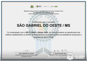 São Gabriel do Oeste São Gabriel do Oeste conquista Selo FNAS e reforça compromisso com a transparência e a qualidade na Assistência Social 30 de março de 2026