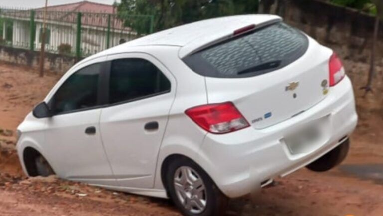 Um veículo Chevrolet Onix ficou preso em uma erosão próximo a BR-163, em Coxim, a 253 quilômetros de Campo Grande. O motorista caiu no buraco