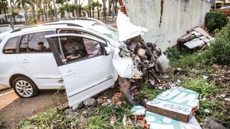 Veículo Space Fox teve a parte da frente destruída após bater em um muro na manhã desta quarta-feira (7), na Avenida Eduardo Elias Zahran, em