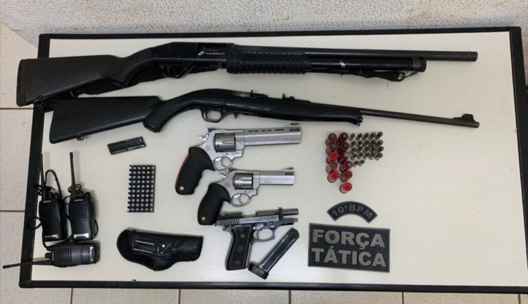 Policiais militares da Força Tática do 10° BPM apreenderam armas, drogas e rádios amadores na invasão da Homex, em Campo Grande, durante a noite desta