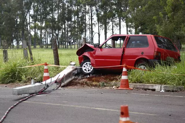 Mulher de 37 anos perdeu o controle da direção e bateu o veículo Fiat Uno em um poste de energia, na Rua Estatícia, Bairro Nova