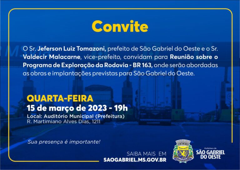 A Prefeitura Municipal de São Gabriel do Oeste realizará nesta quarta-feira, dia 15 de março, uma reunião ampliada para discutir o Programa de Exploração da