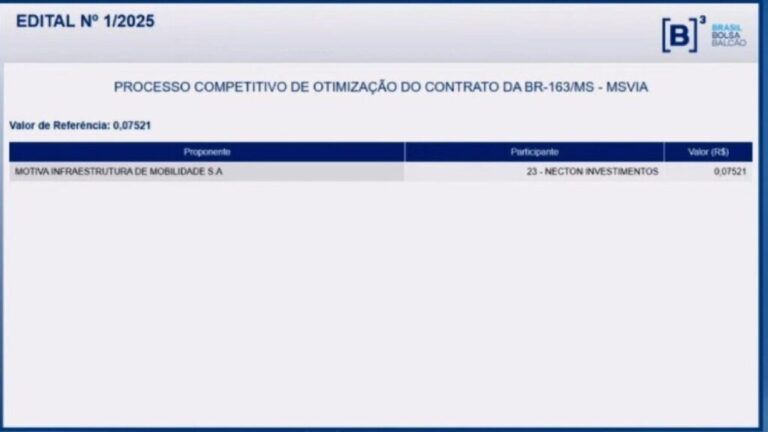 A Motiva — nova marca da CCR — venceu o leilão da BR-163 em Mato Grosso do Sul nesta quinta-feira (22). Assim, a empresa que