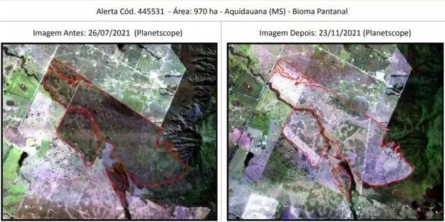 Foi em território sul-mato-grossense, especificamente no município de Aquidauana, que houve o maior desmatamento do bioma pantaneiro – uma área de 970 hectares. O Pantanal registra a maior velocidade média por alerta de desmatamento, com 1,12 hectare extraído por dia.