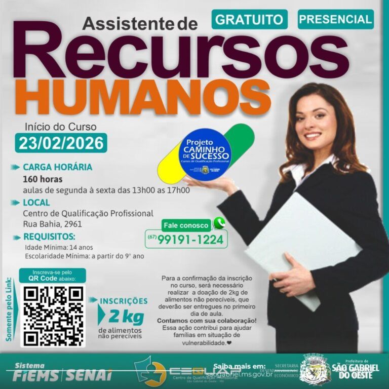 SENAI abre inscrições para curso de Assistente de Recursos Humanos em São Gabriel do Oeste