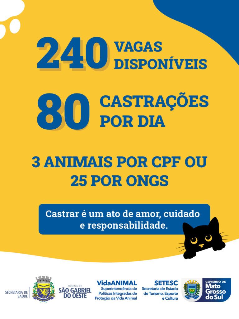 São Gabriel do Oeste será contemplado, nos dias 9, 10 e 11 de fevereiro, com a Caravana da Castração, programa estadual que oferece castração gratuita de cães e gatos. A ação conta com o apoio da Prefeitura de São Gabriel do Oeste, por meio da Secretaria Municipal de Saúde, e tem como foco o fortalecimento das políticas de bem-estar animal, além do controle populacional no município. Os procedimentos serão realizados no Salão da Igreja Nossa Senhora Aparecida.