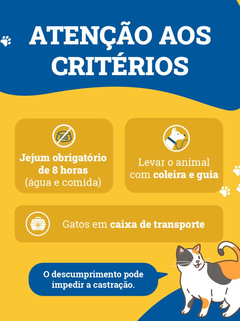 Serão atendidos cães e gatos, machos e fêmeas, com idade de até oito anos, desde que estejam em boas condições de saúde e não apresentem obesidade. A autorização para a realização do procedimento será concedida pela equipe veterinária responsável, após avaliação clínica no dia da cirurgia.