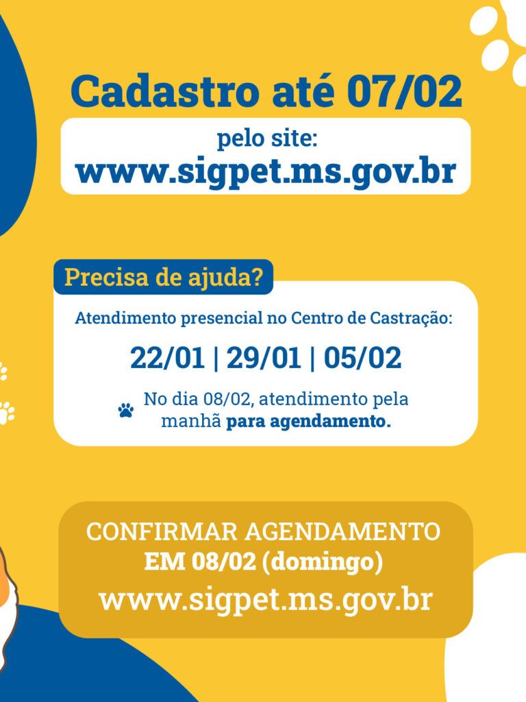O cadastro dos animais deve ser feito até o dia 7 de fevereiro, exclusivamente pelo site www.sigpet.ms.gov.br. Tutores que tiverem dificuldade no acesso ao sistema poderão buscar atendimento presencial no Centro de Castração nos dias 22 e 29 de janeiro e 5 de fevereiro. No dia 8 de fevereiro, haverá atendimento pela manhã para agendamento, sendo necessária a confirmação do agendamento na mesma data, também pelo site.