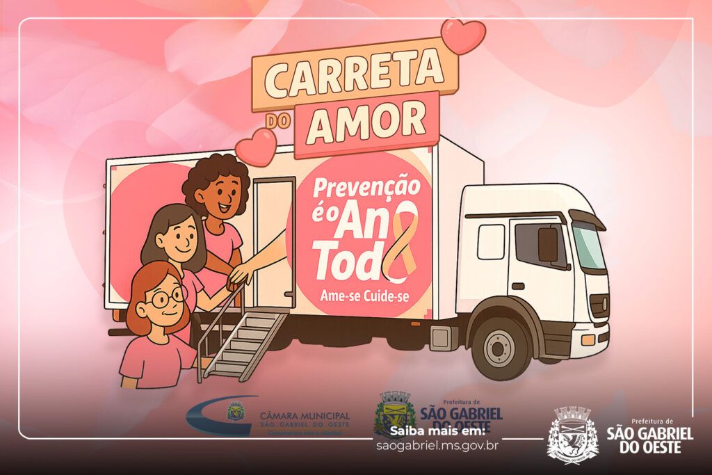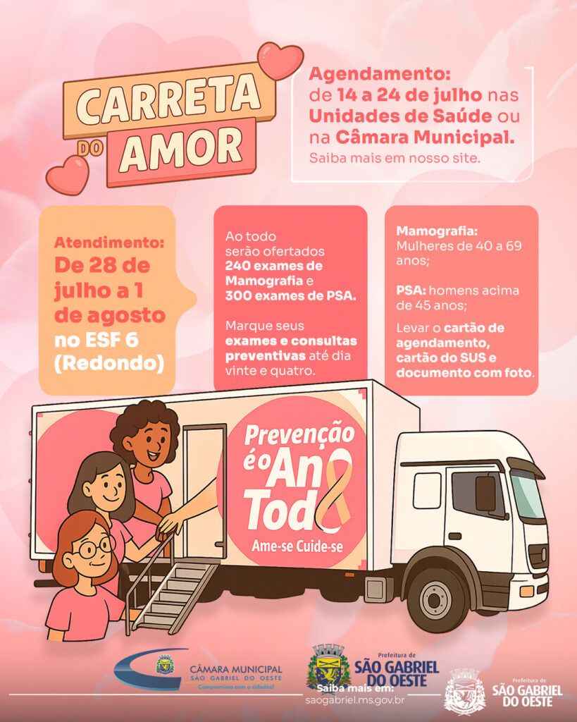 A Prefeitura de São Gabriel do Oeste, por meio da Secretaria Municipal de Saúde, confirma a chegada da Carreta do Hospital de Amor ao município a partir do dia 28 de julho. A unidade móvel estará estacionada em frente à ESF 6 (Redondo) e realizará atendimentos até o dia 1º de agosto, oferecendo gratuitamente exames de mamografia e PSA (antígeno prostático específico).