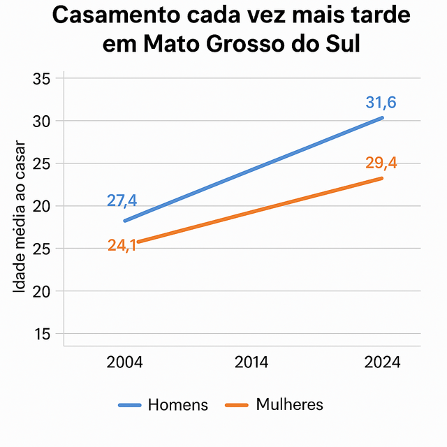Adiamento aparece também na idade dos noivos. Em 2004, homens se casavam aos 27,4 anos e mulheres aos 24,1. Em 2014, as médias já haviam subido para 29,5 e 26,8. Em 2024, Mato Grosso do Sul chega a 31,6 anos para eles e 29,4 para elas.