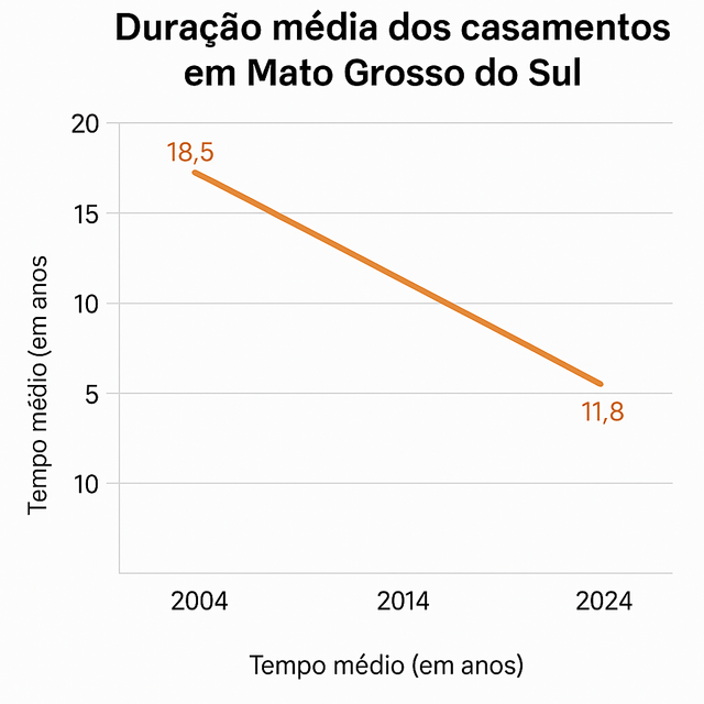 Se os casamentos começam mais tarde, eles também terminam mais cedo. A duração média de um casamento em Mato Grosso do Sul era de 18,5 anos em 2004. Em 2014, já havia caído para 13 anos. Em 2024, atinge 11,8 anos.