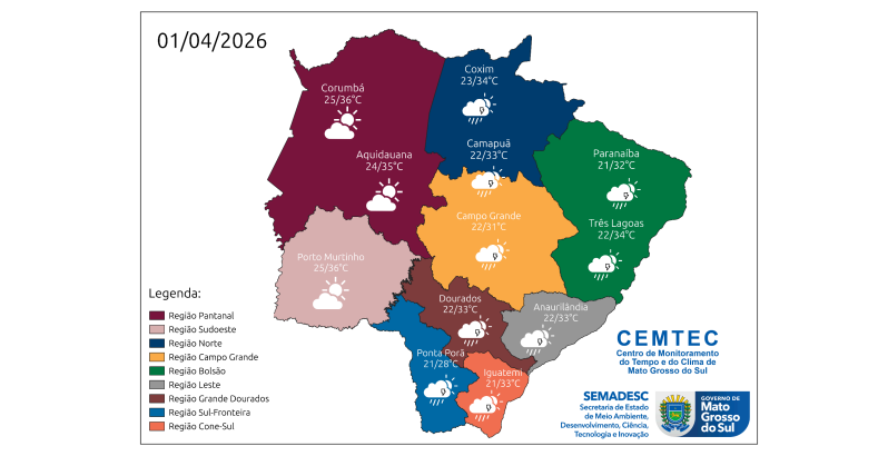 Nesta quarta-feira (1º), Mato Grosso do Sul deve enfrentar calor intenso, com predomínio de sol e variação de nebulosidade, conforme aponta o Cemtec (Centro de Monitoramento do Tempo e do Clima). As temperaturas permanecem elevadas em todas as regiões, podendo atingir máximas de 36°C.