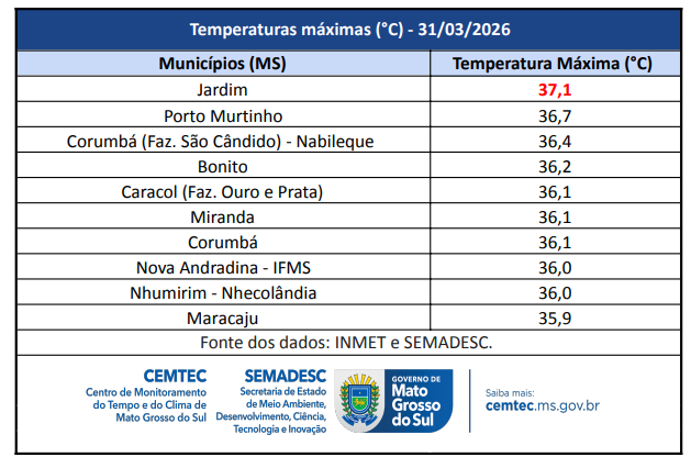 Já as temperaturas seguem altas, acima dos 35°C em diversas cidades, principalmente na região pantaneira. Em Jardim, a máxima alcançou 37,1°C. Confira as máximas registradas nesta terça: