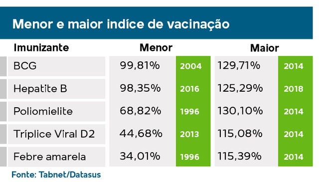 Da poliomielite, a cobertura mais baixa antes de 2020 e 2021 foi em 1996, com taxa de 68,82%, e da BCG, em 99,81%, em 2004. Hepatite B teve o índice mais baixo em 98,35% no ano de 2016.