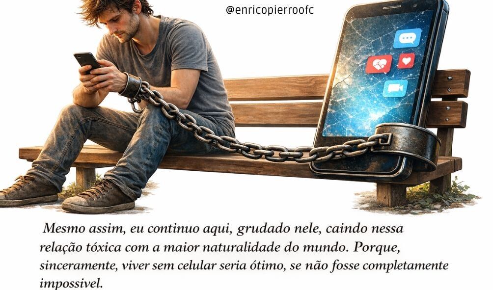 Mesmo assim, eu continuo aqui, grudado nele, caindo nessa relação tóxica com a maior naturalidade do mundo. Porque, sinceramente, viver sem celular seria ótimo, se não fosse completamente impossível.