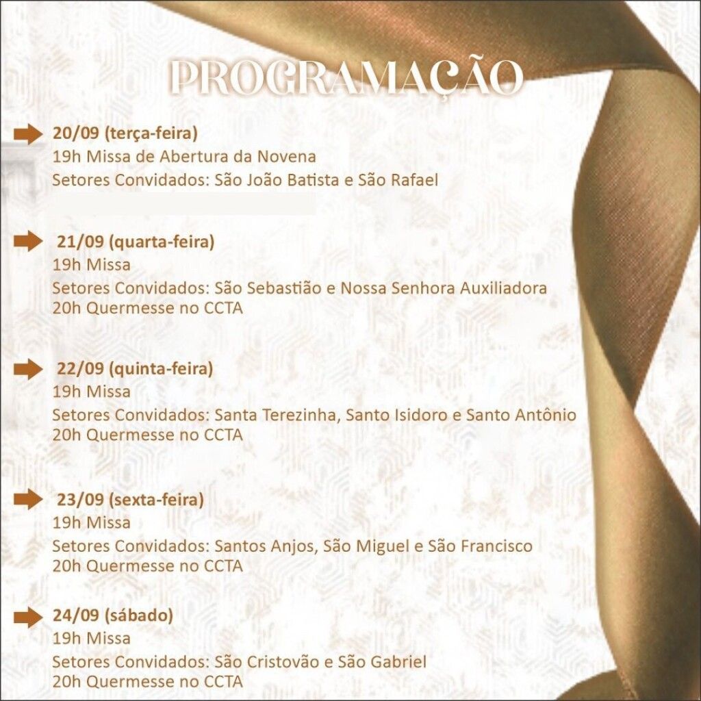 Entre hoje e sábado, as missas serão realizadas às 19h na Matriz, sempre com quermesse e barracas típicas de alimentação no CCTA após às 20h, já no domingo, a agenda contará com uma celebração às 9h na Igreja, almoço com churrasco a partir das 11h no CCTA, leilão, show de prêmios e matinê dançante com entrada franca.