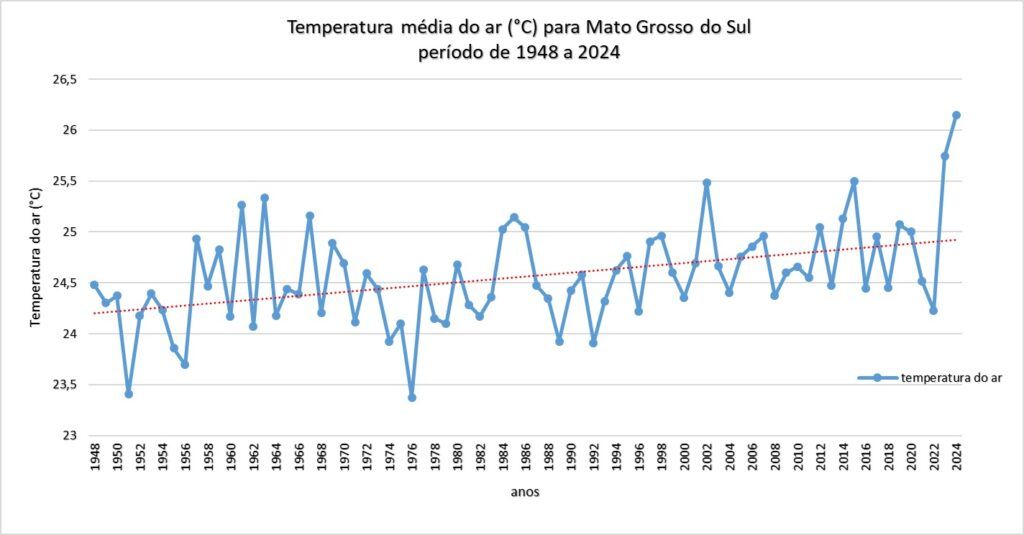 Em 2023 e 2024, as temperaturas médias em Mato Grosso do Sul foram as mais altas da história, com 25,7 e 26,1 graus, respectivamente, segundo o meteorologista Vinícius Sperling, do Cemtec. A temperatura média medida desde 1948 é de 24,6 graus.