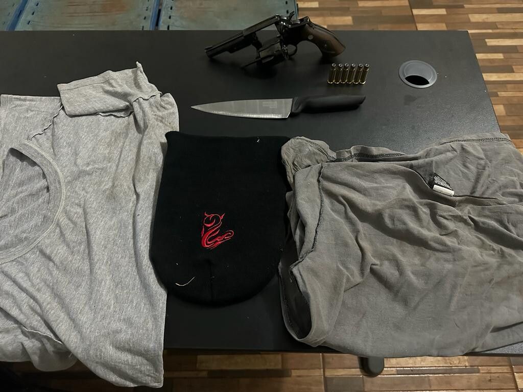 Durante a revista foi encontrado um revólver calibre .357 Magnum Special, com cabo de madeira, com 06 munições e um Faca com uma lâmina de aproximadamente 15cm. Os indivíduos afirmaram que a arma de fogo pertencia a um amigo e que ambos estavam indo testá-la no mato.