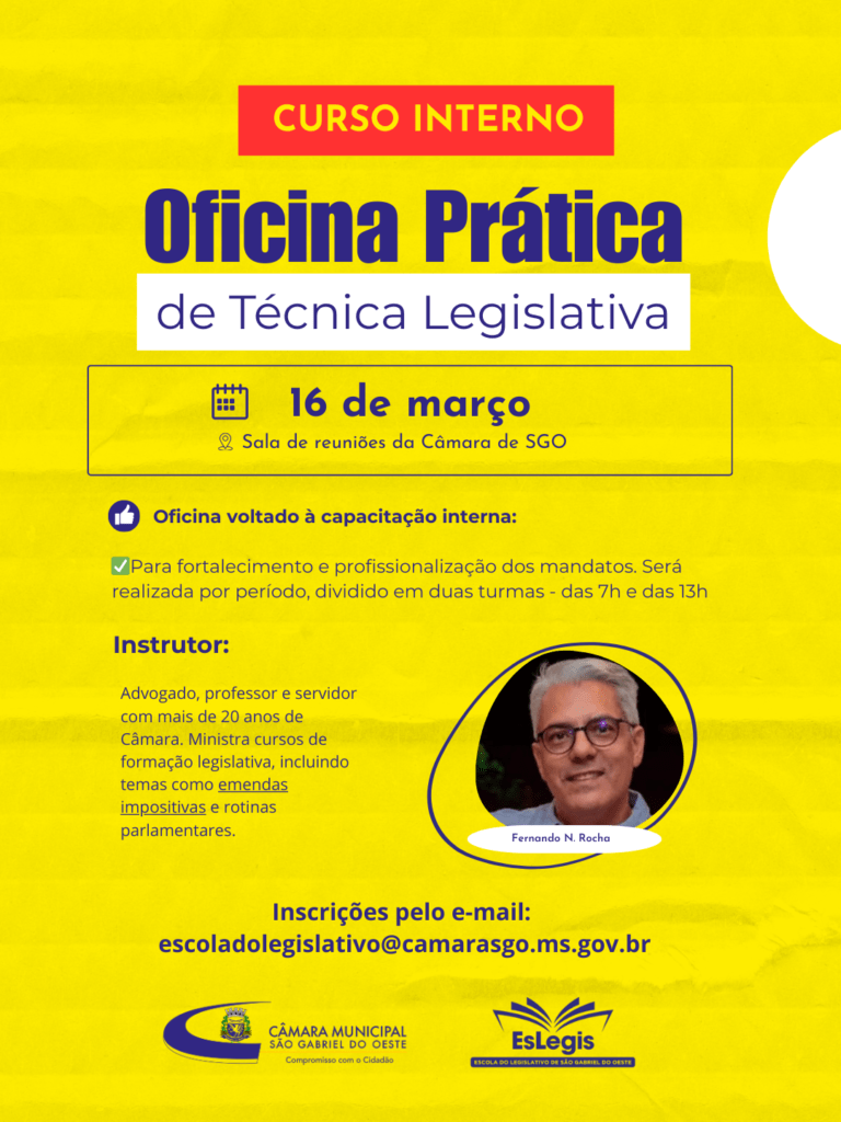 A formação será conduzida pelo advogado, professor e servidor legislativo Fernando N. Rocha, profissional com mais de 20 anos de experiência no setor. Durante a oficina, ele abordará temas ligados à prática do dia a dia do Legislativo, como elaboração de proposições, organização das rotinas parlamentares e aspectos relacionados às emendas impositivas.