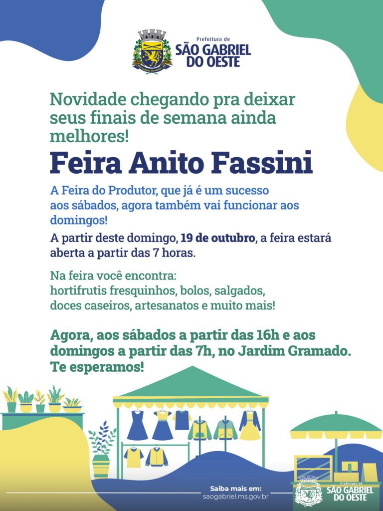 A Feira do Produtor Anito Fassini, um dos espaços queridos pelos moradores de São Gabriel do Oeste, traz uma novidade que promete deixar os finais de semana ainda mais animados: a partir deste domingo, 19 de outubro, a feira também funcionará aos domingos, a partir das 7 horas da manhã, no bairro Jardim Gramado, ao lado do Estádio Municipal.