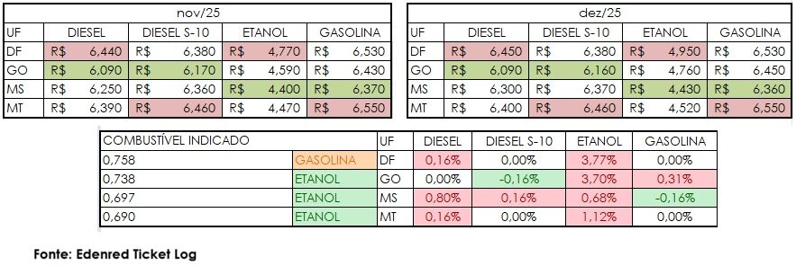 Na análise regional, o Centro-Oeste apresentou aumento nos preços do etanol, gasolina e diesel comum em dezembro. Segundo a Edenred Ticket Log, o etanol subiu 2,21%, a gasolina 0,15% e o diesel comum 0,48%, enquanto o diesel S-10 manteve estabilidade. Para Renato Mascarenhas, diretor da Edenred Mobilidade, mesmo com os reajustes, o etanol seguiu como a opção economicamente mais vantajosa em todos os estados da região.