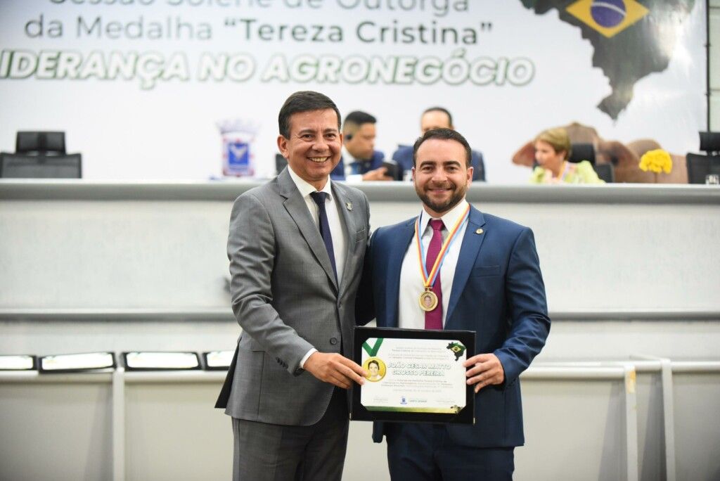 Na última sexta-feira (6), o deputado João César Mattogrosso (PSDB) representou a Assembleia Legislativa e foi um dos homenageados na solenidade de outorga da ‘Medalha Tereza Cristina de Liderança no Agronegócio’ da Câmara Municipal de Campo Grande. O reconhecimento enalteceu a atuação de lideranças e pesquisadores do agronegócio, um dos principais pilares da economia regional e nacional.