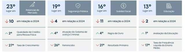 Nos piores índices, Mato Grosso do Sul aparece em 23º lugar no potencial de mercado, caindo 10 posições em relação a 2024. O principal motivo foi o fraco desempenho no índice de crescimento econômico, o menor entre todas as 27 unidades da federação.