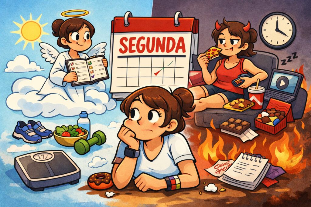 Na terça, às 14h, você já está comendo um doce proibido, ignorando notificações do aplicativo e prometendo: “semana que vem eu começo mesmo!”. Essa parte é importante: nunca desistir da mentira. Ela sustenta nossa esperança.