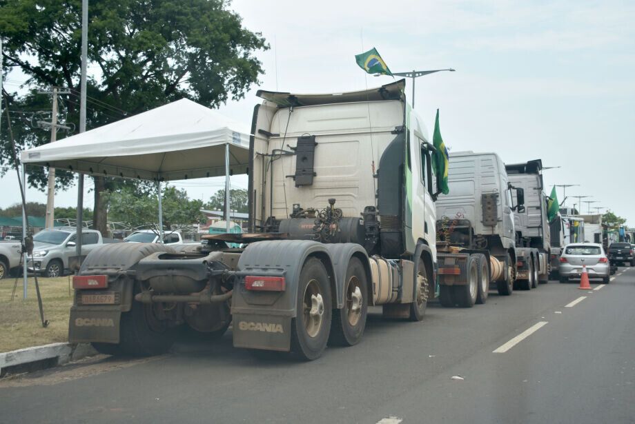 Caminhões de transportadoras ajudam a obstruir a principal via de acesso ao aeroporto de Campo Grande, à Base Aérea, aos quatéis e ao Comando Militar do Oeste (CMO), aonde o ato está concentrado.