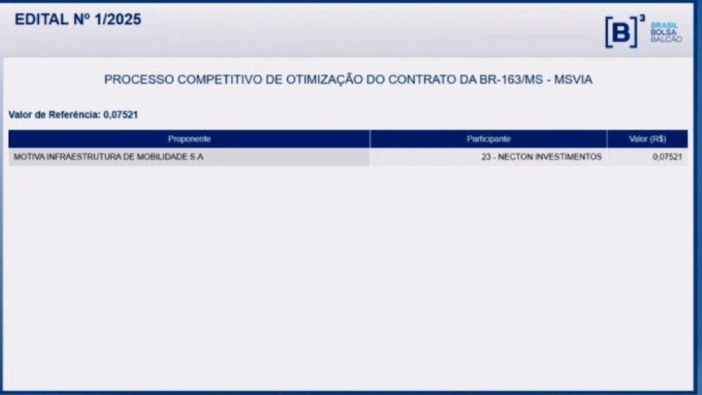 Conforme sessão do leilão, a proposta da Motiva foi de R$ 0,07521 por Km para a tarifa pedágio. O valor é o mínimo previsto no edital da ANTT (Agência Nacional de Transportes Terrestres). Com o leilão, a rodovia terá menos duplicações em MS.