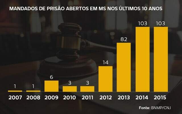 Segundo dados do CNJ, em relação aos mandados de prisão, há os que completam uma década, sendo expedidos em 2008 (1), 2009 (6), 2010 (3), 2011 (3), 2012 (14), 2013 (82), 2014 (103) e 2015 (103). Alguns podem se referir ao mesmo autor, em diferentes processos.