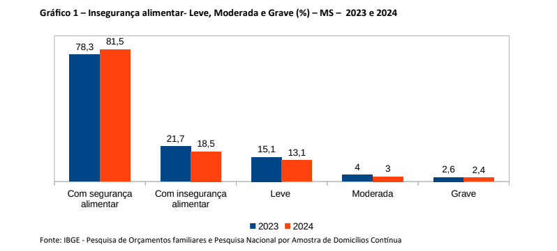 Na insegurança alimentar moderada, a restrição envolve a quantidade de alimentos disponíveis no lar. Em Mato Grosso do Sul, 3% dos domicílios enfrentavam esse nível de restrição em 2024, uma queda de um ponto percentual em relação ao ano anterior.