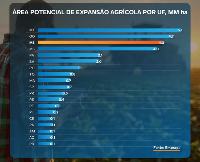 Mato Grosso do Sul (MS) está entre os três estados com maior área de pastagens degradadas no Brasil, em 3º lugar, com 4,3 milhões de hectares, com potencial para a produção de grãos, principalmente soja e milho. Os dados fazem parte do relatório Radar Agro, elaborado pelo Itaú BBA e intitulado “Áreas de pastagens degradadas e potencial de conversão para lavouras no Brasil”;