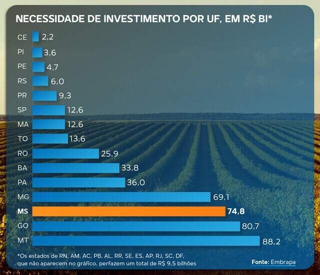 Para restaurar os 4,3 milhões de hectares degradados no Estado, seriam necessários cerca de R$ 75 bilhões. Em âmbito nacional, o investimento estimado para converter os 28 milhões de hectares de pastos degradados gira em torno de R$ 482,6 bilhões.