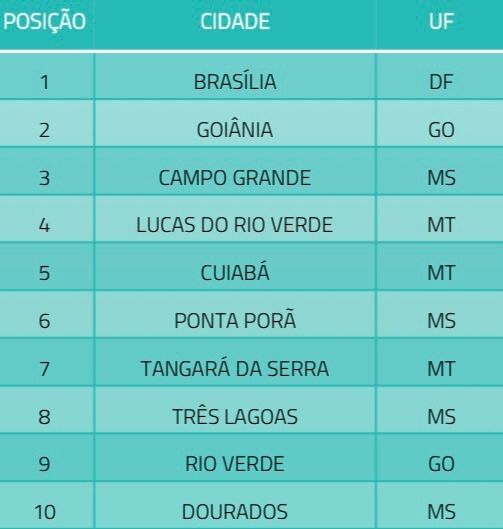 Em âmbito nacional, as 10 cidades brasileiras que lideraram o Ranking Brasileiro foram: