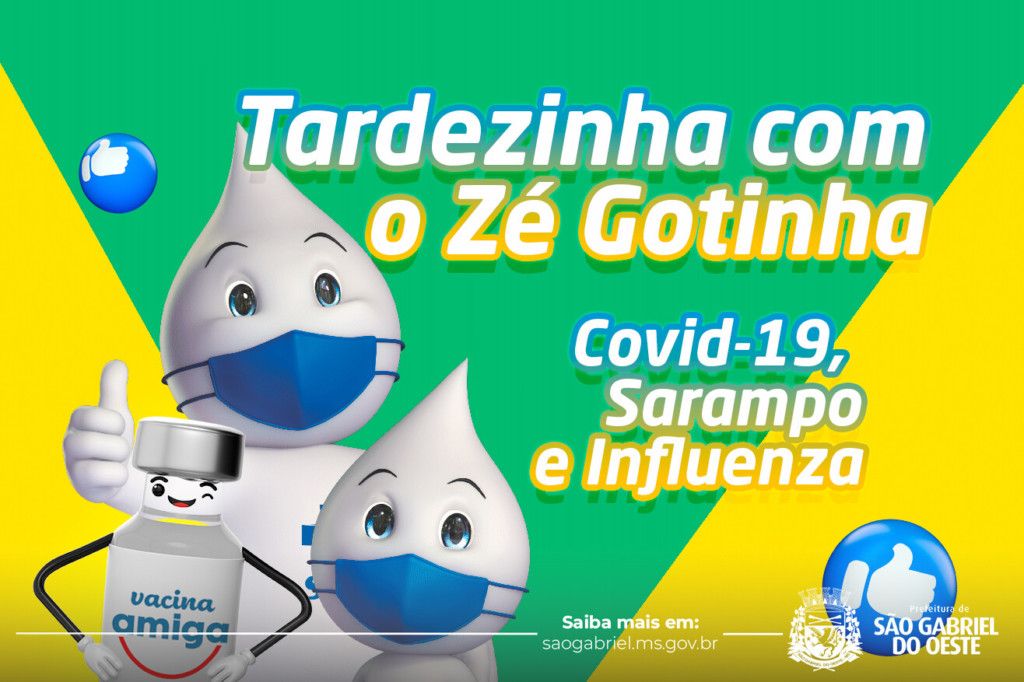 A Secretaria de Saúde de São Gabriel do Oeste realiza na próxima semana mais um mutirão de vacinação na cidade. Na terça-feira (07) e na quinta-feira (09) acontece a Tardezinha com o Zé Gotinha, uma ação com aplicação de doses de vacina contra a Covid-19, contra a Influenza e também contra o sarampo.
