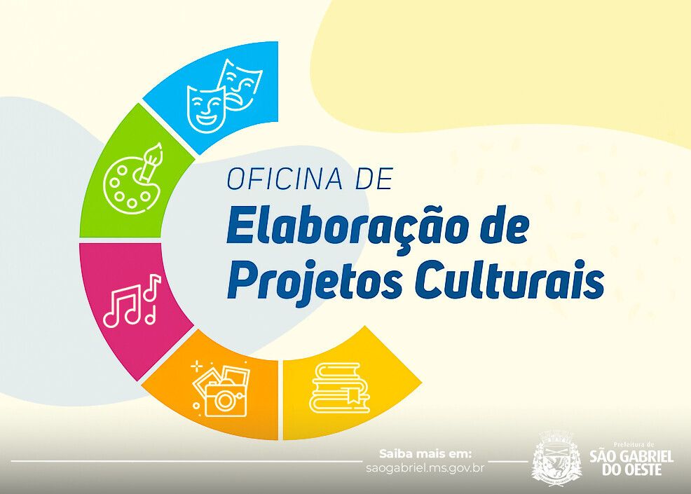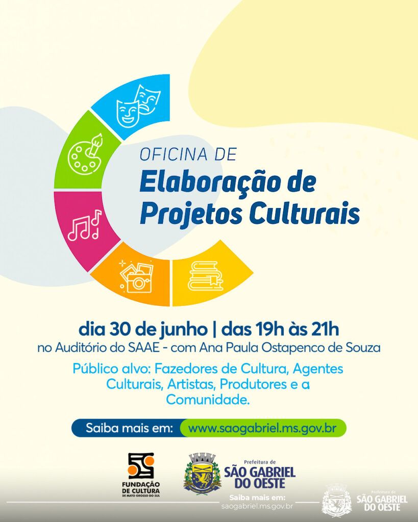 A Prefeitura de São Gabriel do Oeste, por meio da Secretaria Municipal de Cultura, Desporto e Turismo, promove no próximo dia 30 de junho, das 19h às 21h, no Auditório do SAAE, uma oficina voltada à capacitação de agentes culturais do município. A proposta é apresentar o que é um projeto cultural e orientar sobre seu processo de elaboração.