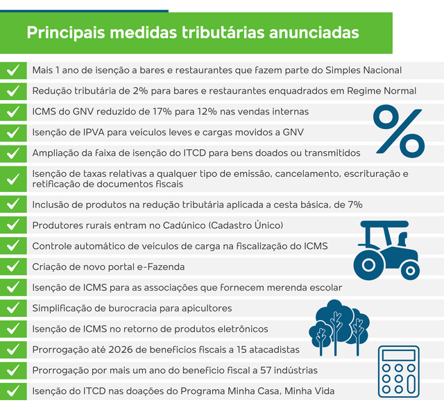 Dentre as medidas previstas, está redução na carga tributária sobre alguns alimentos, prorrogação de benefícios para bares, restaurantes e similares, além da isenção de IPVA para automóveis movidos a GNV (Gás Natural Veicular), como incentivo ao uso do combustível menos poluente.
