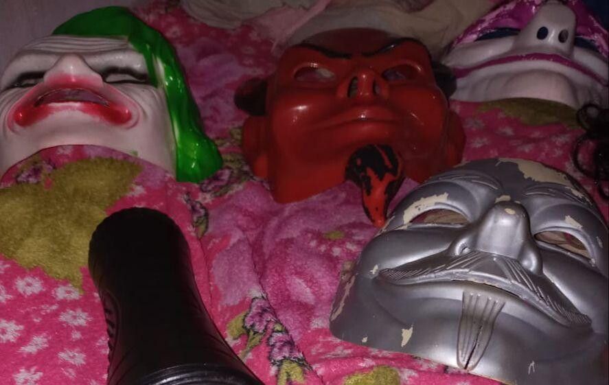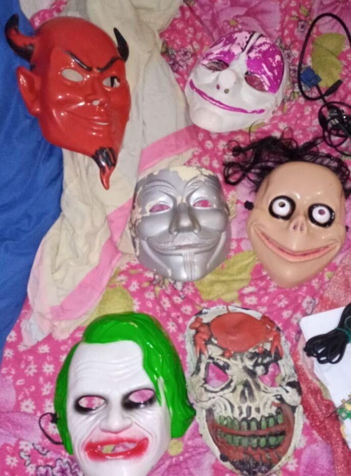 Os policiais federais cumprem mandado de busca e apreensão expedido pela Justiça Federal na casa de um investigado, em Maranguape (CE). Na operação, os agentes encontraram diversas mascaras de terror e centenas de arquivos ilegais.