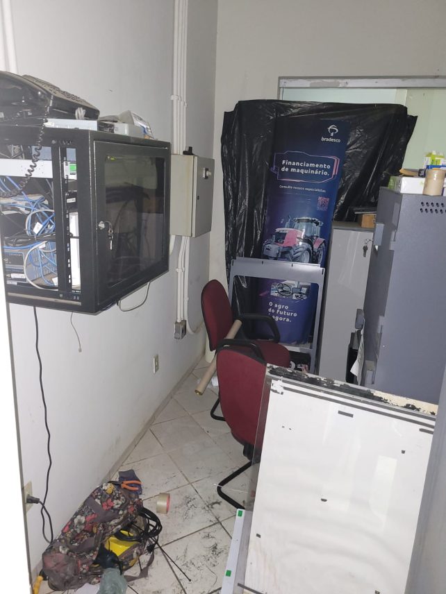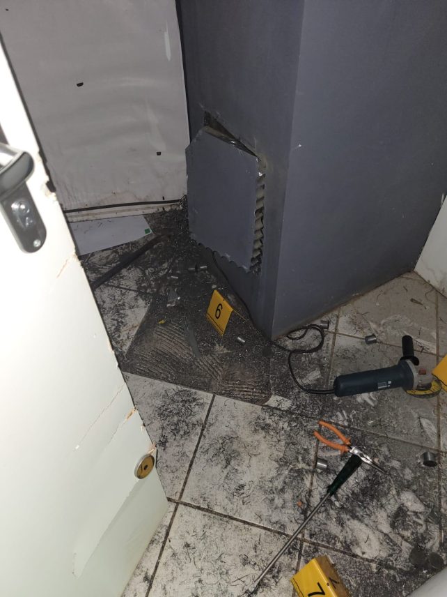 Dentro da agência bancária foi visualizado que eles já teriam inclusive cortado um caixa eletrônico, entretanto em razão da ação policial, não conseguiram acessar as cédulas. No local foram apreendidas, uma furadeira eletromagnética, duas lixadeiras, chaves de fenda, um pé de cabra, luvas, óculos, brocas e óleo solúvel para refrigerar as brocas e vários discos de cortar metal.