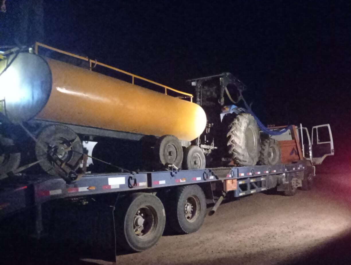Durante o policiamento ostensivo em uma rodovia da zona rural, os policiais avistaram um caminhão prancha transportando um trator e rebocando um tanque de combustível, uma combinação que despertou desconfiança devido ao horário e às características da carga. A equipe realizou a abordagem do veículo, ocupado por dois homens, de 29 e 19 anos.