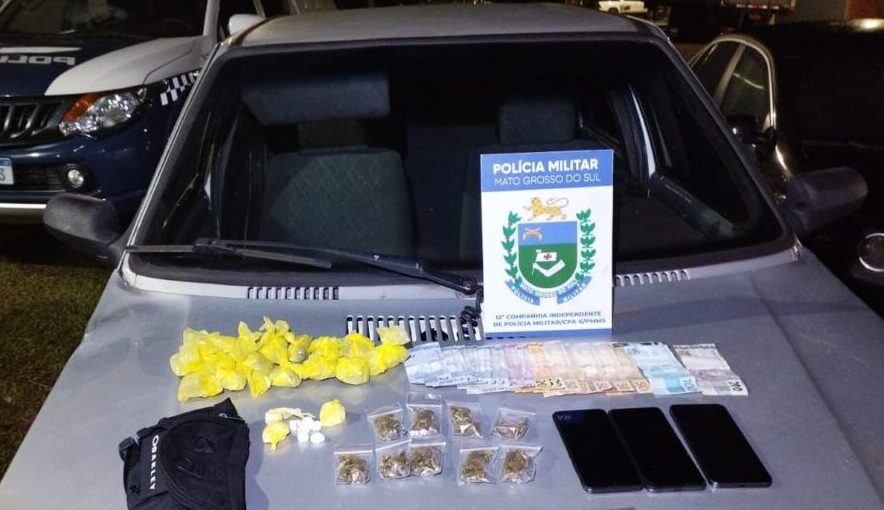 A Polícia Militar prendeu um homem de 32 anos e apreendeu um homem de 17 anos por tráfico de drogas e direção perigosa na madrugada desta última quarta-feira em São Gabriel do Oeste. Um outro indivíduo, que estava junto com a dupla, fugiu sozinho e foi ignorado pela equipe.