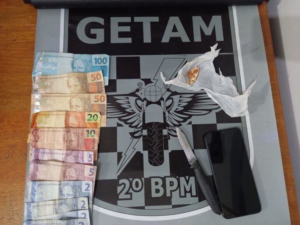 Momento que realizaram uma abordagem policial, localizando dinheiro com os abordados e uma porção de substância análoga a “crack” totalizando aproximadamente 5,8 gramas. Durante a abordagem, ainda chegou ao local mais um usuário de drogas, munido de R$20,00 vinte reais em dinheiro afirmando sua presença para realizar a compra da substância.