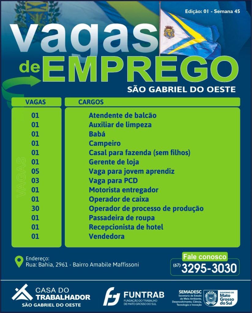 A Prefeitura Municipal de São Gabriel do Oeste, através da Casa do Trabalhador, está divulgando uma variedade de vagas de emprego. Essas oportunidades abrangem diferentes áreas e níveis de experiência, proporcionando uma série de opções para os interessados em ingressar ou retornar ao mercado de trabalho.