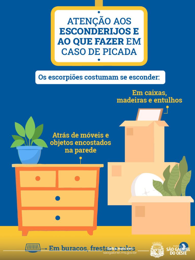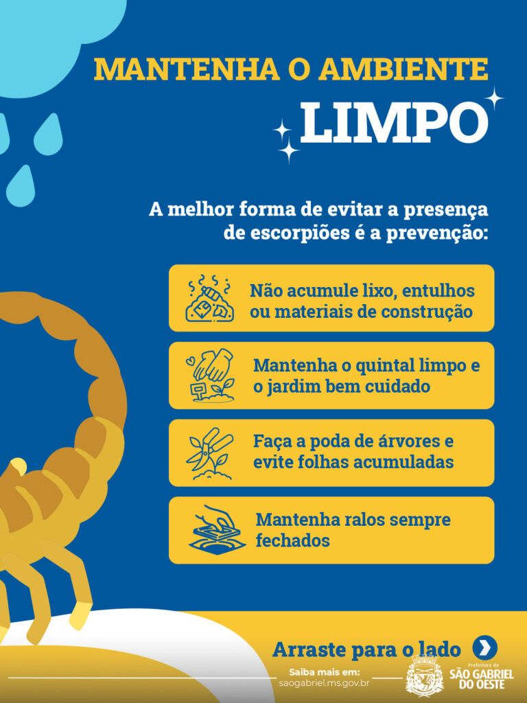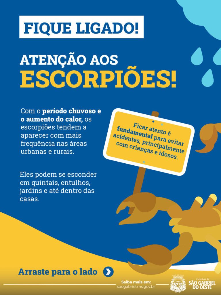 Com a chegada do período chuvoso e a elevação das temperaturas, a Prefeitura de São Gabriel do Oeste faz um alerta à população sobre o aumento da presença de escorpiões, tanto em áreas urbanas quanto rurais. A combinação de calor e umidade cria o ambiente ideal para a proliferação desses animais, que costumam buscar abrigo próximo às residências.