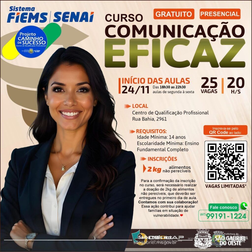 A Prefeitura de São Gabriel do Oeste, por meio do Centro de Qualificação Profissional, em parceria com o SENAI, está com inscrições abertas para o curso gratuito de Comunicação Eficaz.