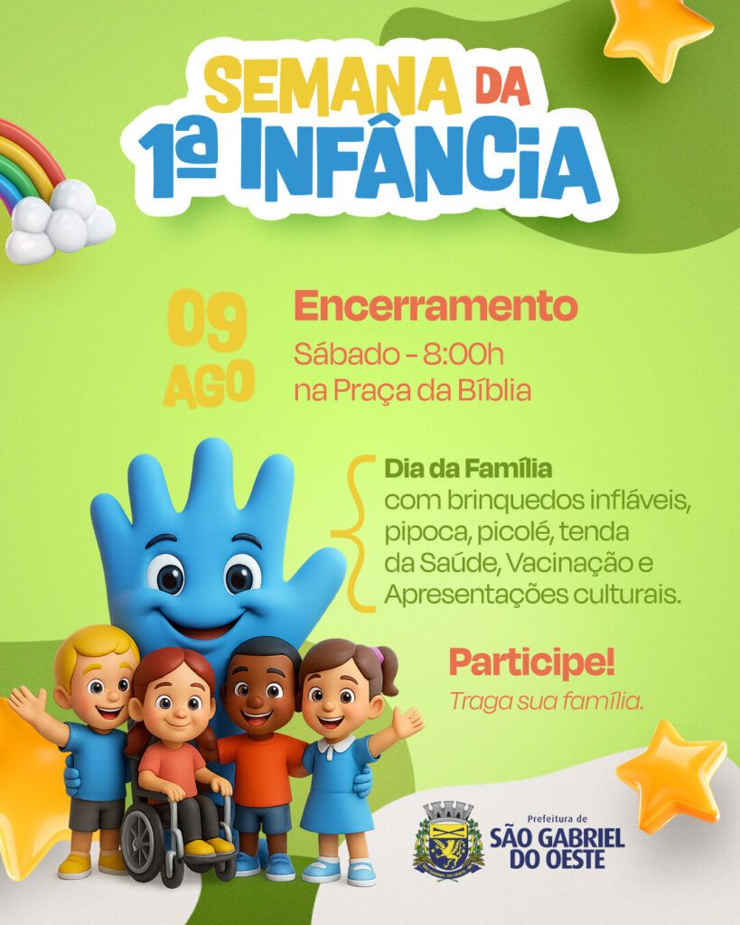 A Prefeitura de São Gabriel do Oeste promove neste sábado, 9 de agosto, o “Dia da Família”, evento que marca o encerramento da Semana da Primeira Infância. A programação terá início a partir das 8h, na Praça da Bíblia, e será aberta a toda a comunidade.