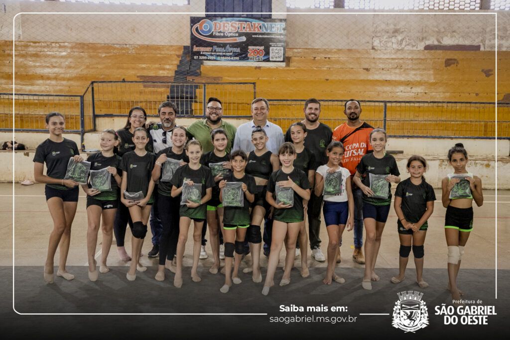 O prefeito de São Gabriel do Oeste, Leocir Montanha, acompanhado do secretário interino de Cultura, Desporto e Turismo, Daniel Paganotti, de membros da equipe da Secretaria Municipal de Cultura, Desporto e Turismo (Secdet) e do vereador Edson Tozetto, participou da entrega de kits de uniforme às alunas do Projeto de Ginástica Rítmica, coordenado pela professora Dayany Lopes Flores da Costa.