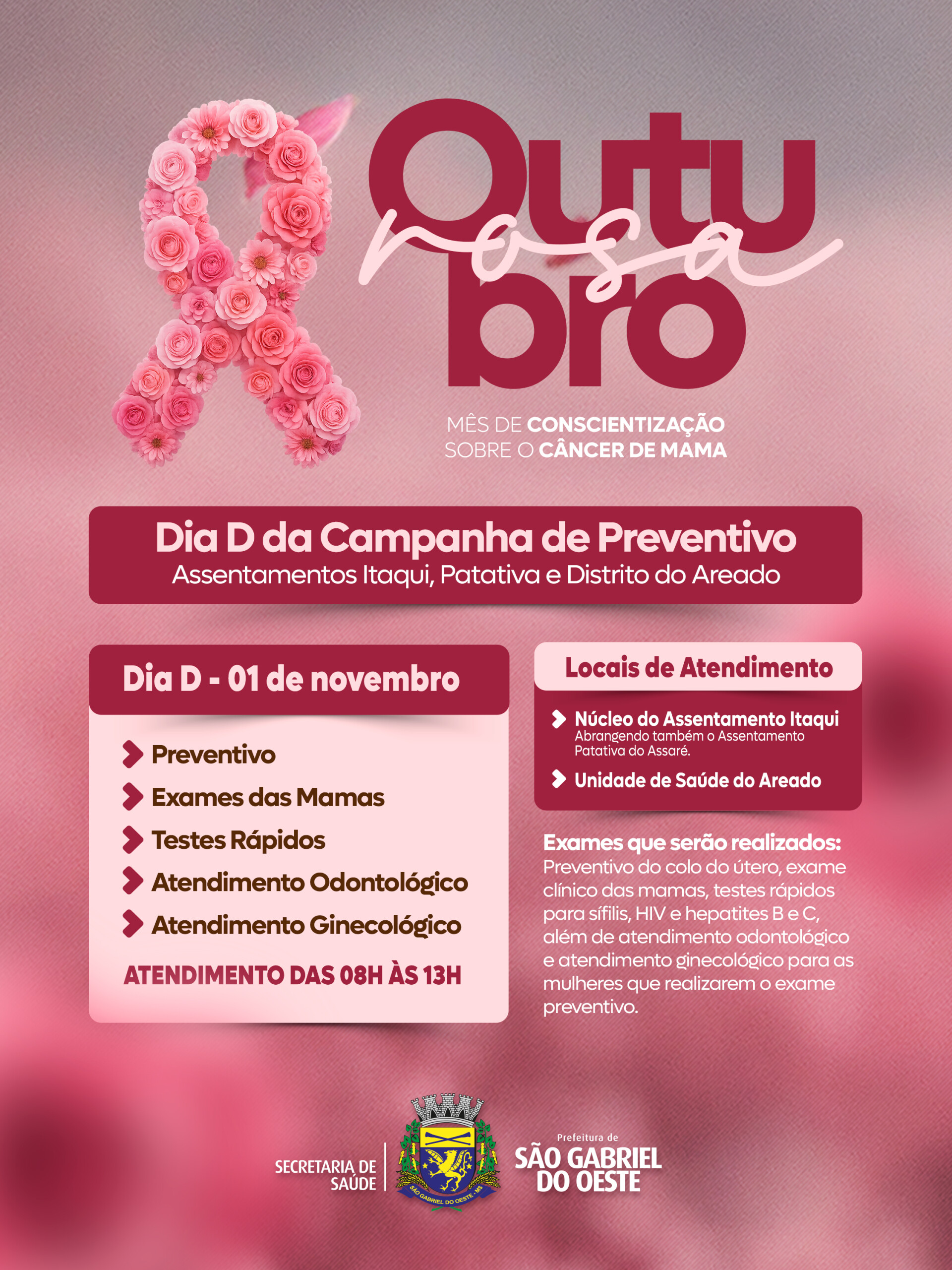 A Prefeitura de São Gabriel do Oeste, por meio da Secretaria Municipal de Saúde, realizará no próximo sábado, dia 1º de novembro, o Dia D da Campanha de Preventivo no Distrito do Areado e no Assentamento Itaqui, abrangendo também os moradores do Assentamento Patativa do Assaré. A ação faz parte da campanha Outubro Rosa, dedicada à conscientização sobre o câncer de mama e o câncer do colo do útero.