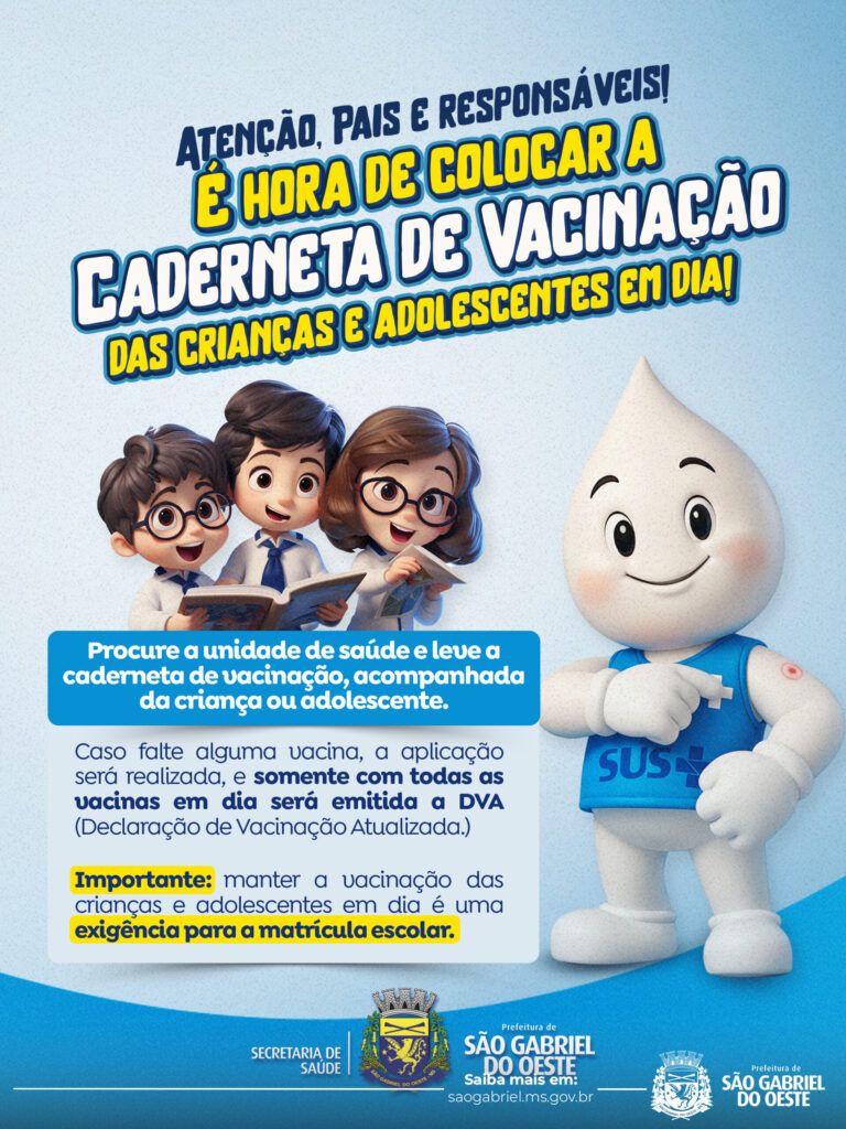 Com a proximidade do período de matrículas e rematrículas escolares, a Prefeitura de São Gabriel do Oeste, por meio da Secretaria Municipal de Saúde, reforça a importância de manter a caderneta de vacinação de crianças e adolescentes atualizada.